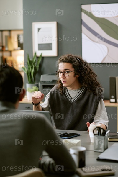 Молодой белый мужчина объясняет стратегию проекта во время офисной встречи