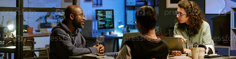 Мультиэтнические молодые взрослые сотрудничают во время ночного офисного совещания