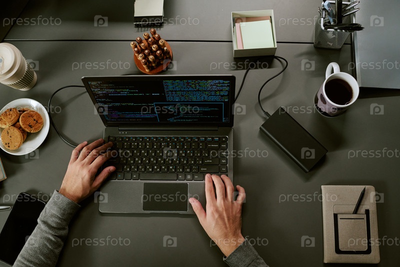 Кавказский молодой взрослый мужчина программирует на ноутбуке, работая за рабочим столом