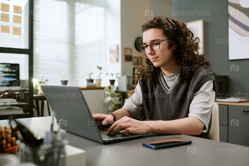 Молодой взрослый кавказский мужчина работает на ноутбуке в современной офисной обстановке
