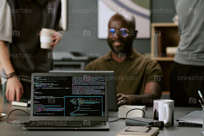 Молодой взрослый чернокожий мужчина улыбается, сотрудничая в современном офисном рабочем пространстве