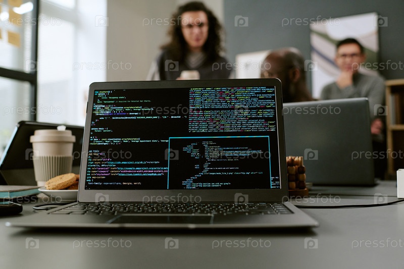 Молодые взрослые мужчины сотрудничают в офисе, пока ноутбук отображает программный код
