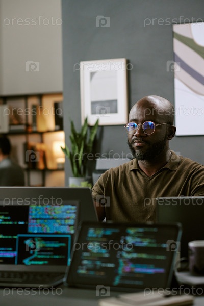 Молодой чернокожий человек сосредоточился на разработке программного обеспечения в современном офисе