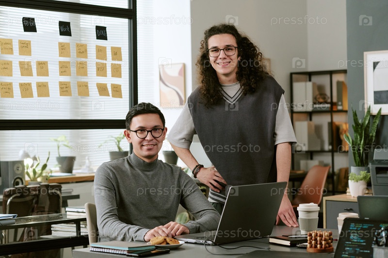 Два молодых взрослых белого пола сотрудничают над проектом в современном офисе