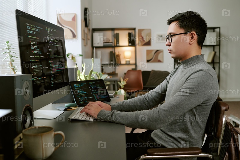 Young Adult Asian Man Программное обеспечение для кодирования на компьютере и ноутбуке в современном офисе