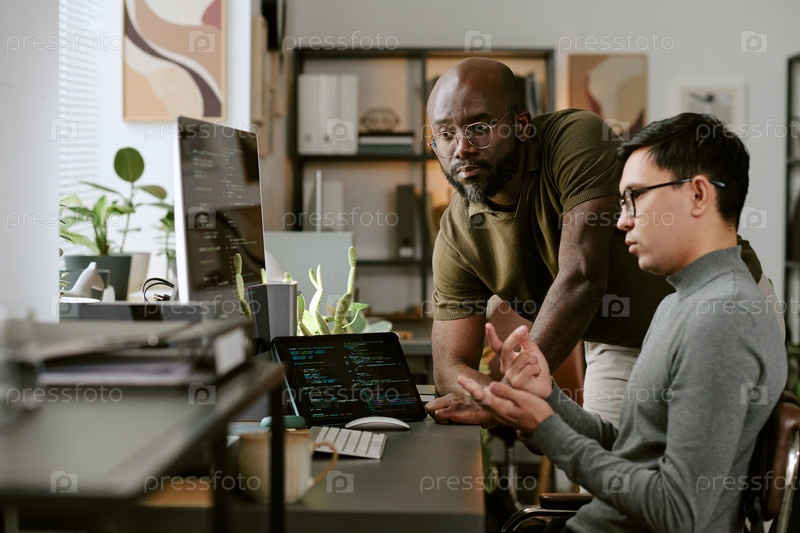 Молодой чернокожий мужчина контролирует молодого взрослого азиатского мужчину, кодирующего на ноутбуке