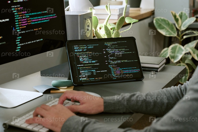 Кавказский молодой взрослый мужчина программирует программное обеспечение на компьютере и планшете в офисе