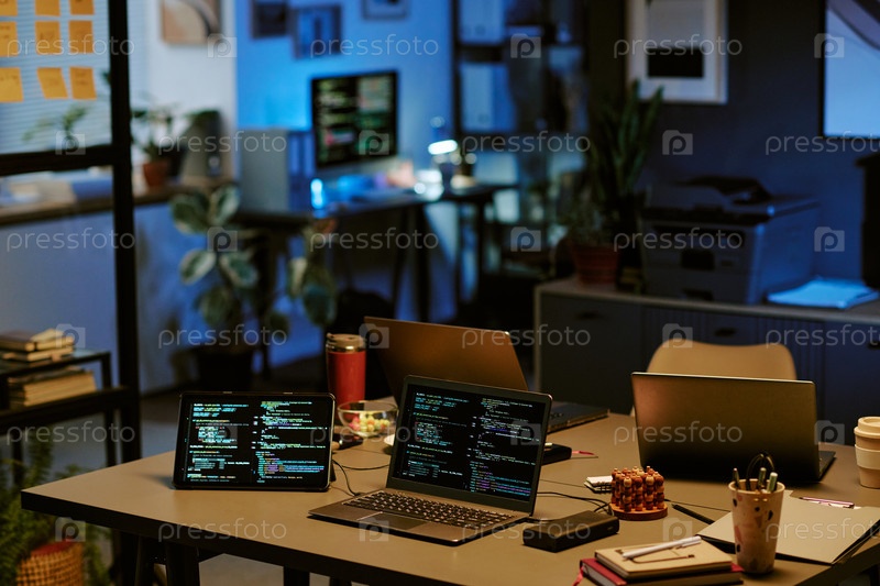 Пустое рабочее пространство офиса с несколькими ноутбуками, отображающими программный код