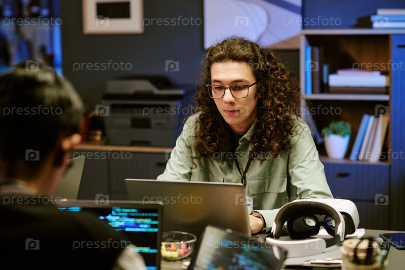 Молодой белый мужчина разрабатывает программное обеспечение на ноутбуке в современном офисе