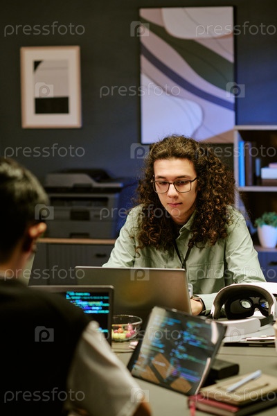 Молодой взрослый белый мужчина сотрудничает с коллегой во время программирования за рабочим столом