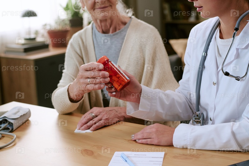 Кавказская женщина получает рецептурные лекарства от старшего врача