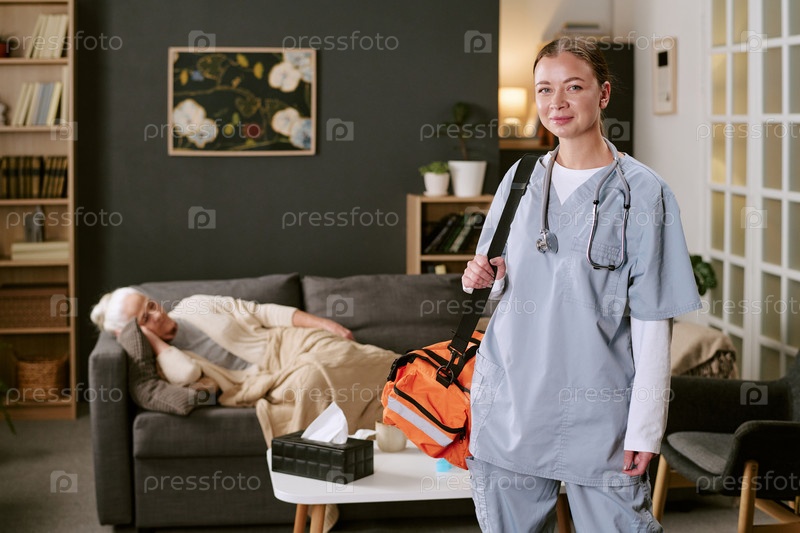Молодая взрослая белая женщина медсестра посещает старшую белую женщину дома