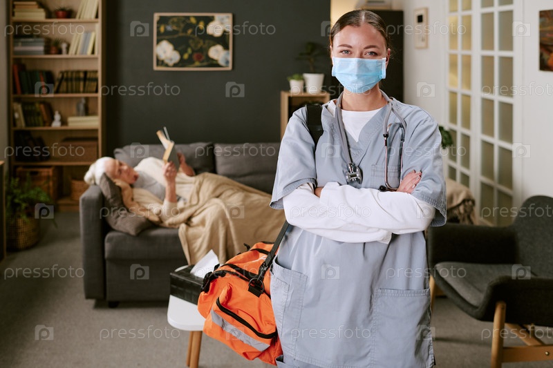 Молодая белая медсестра уверенно стоит в доме престарелых пациентов