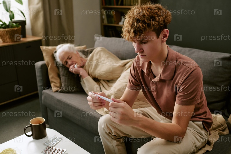 Кавказский мальчик-подросток использует цифровой термометр, пока старшая женщина отдыхает