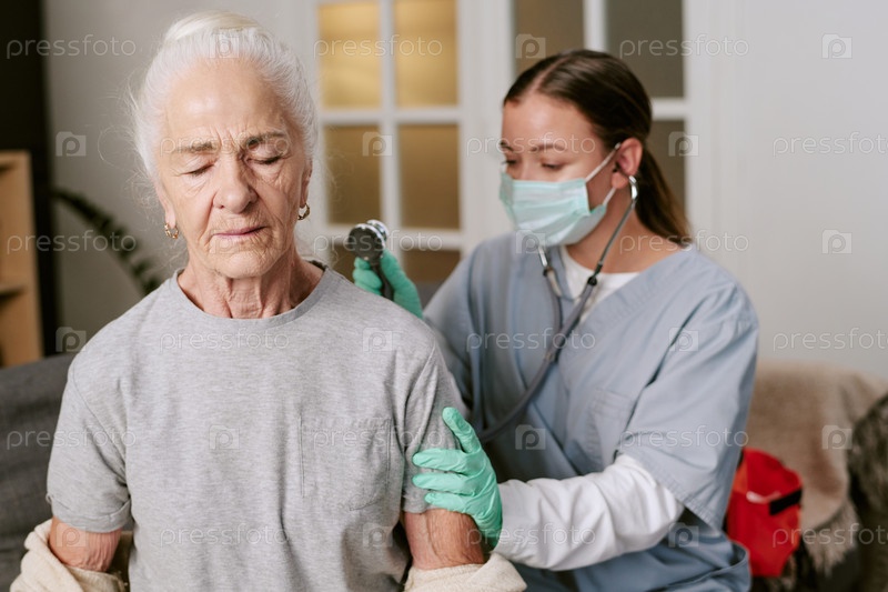 Старшая кавказская женщина проходит оценку дыхательных путей у медсестры