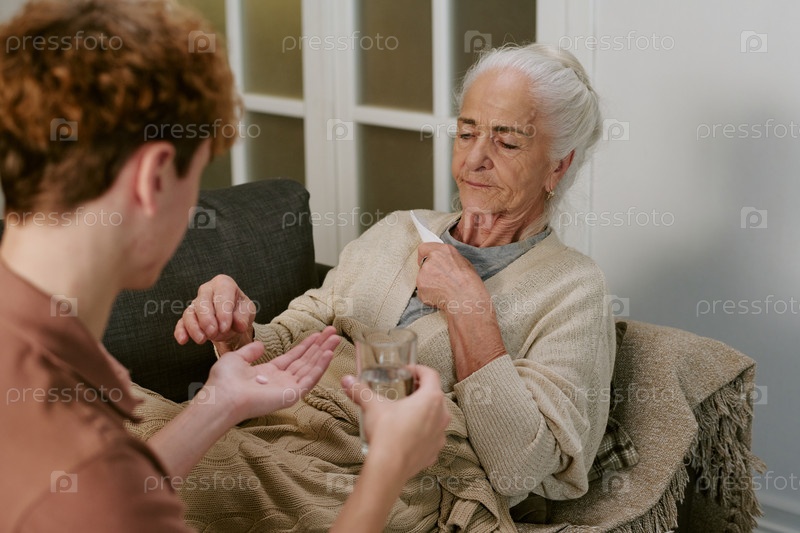 Старшая кавказская женщина принимает лекарства от подростка, предлагающего стакан воды