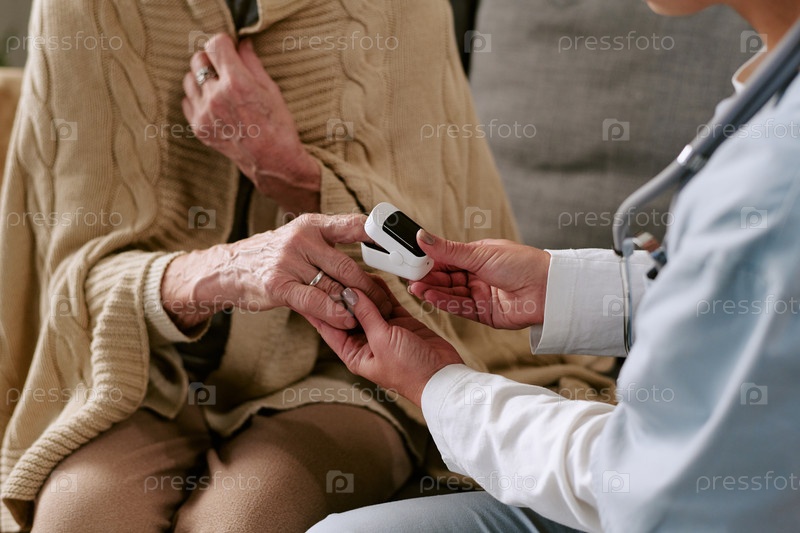 Медицинская женщина среднего возраста измеряет уровень кислорода у старшей белокожей женщины