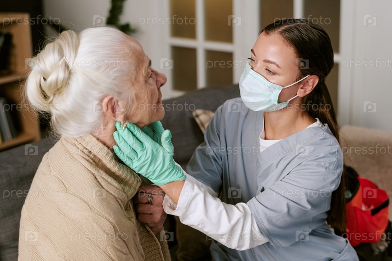 Молодая белая медсестра осматривает старшую белую женщину в медицинском учреждении