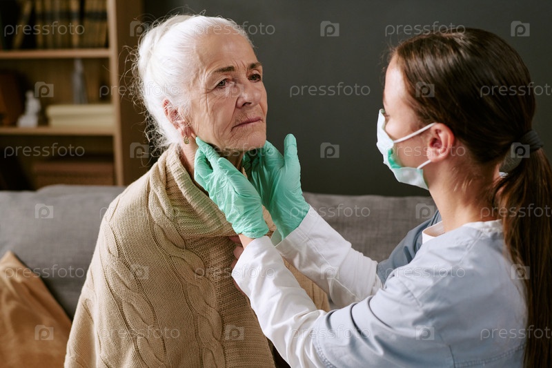 Сестра осматривает старшую белую женщину во время медицинского обследования дома