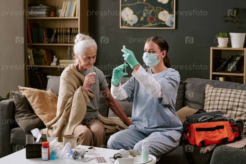 Белая медсестра средних лет готовит инъекцию для старшей белой женщины