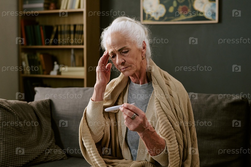 Старшая кавказская женщина проверяет термометр, сидя на диване дома