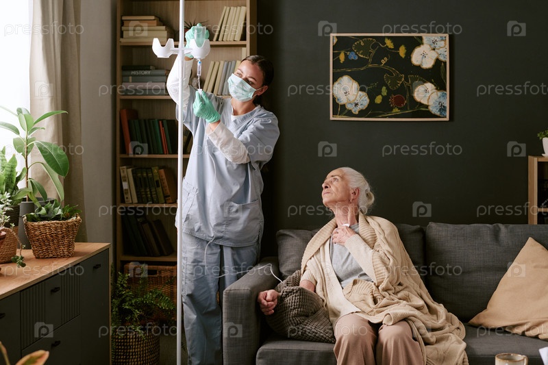 Сестра среднего возраста, регулирующая IV-капельку для старшей белокожей женщины