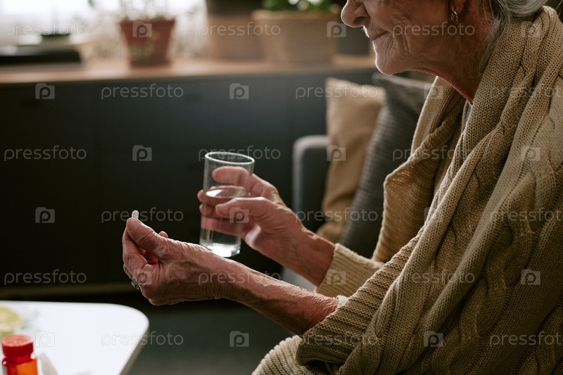 Старшая кавказская женщина держит таблетки и стакан воды, сидя в помещении