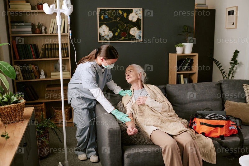 Белая медсестра среднего возраста помогает старшей белокожей женщине, получающей IV терапию