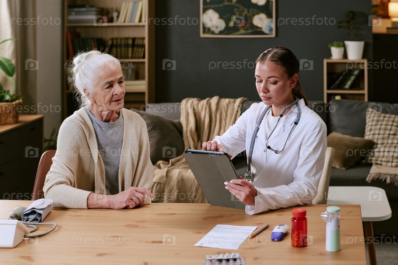 Caucasian Senior Woman Consulting Female Doctor Reviewing Medical Records Кавказская старшая женщина консультирует женщину врачом, который рассматривает медицинские записи