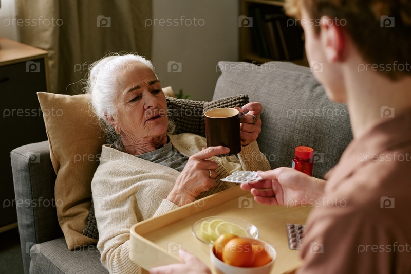 Пожилая белокожая женщина лежит на диване, получает лекарства и горячий напиток