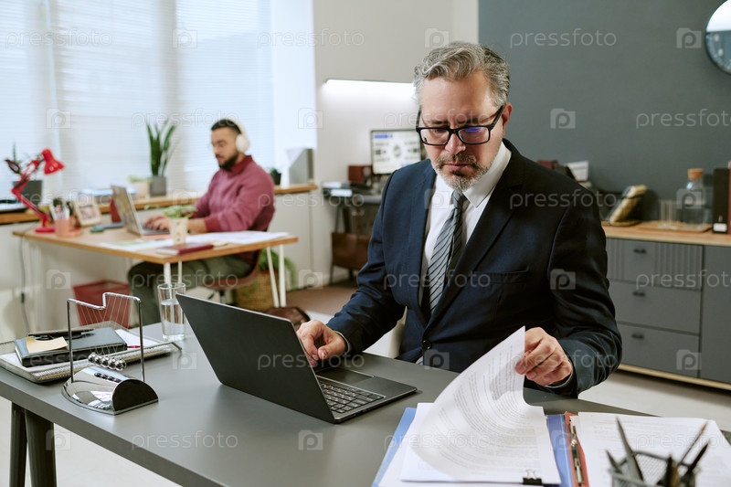 Мужчина средних лет просматривает документы, работая на ноутбуке в офисе