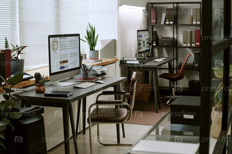 Пустое рабочее пространство офиса с компьютерными мониторами и современными внутренними растениями