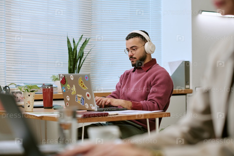 Молодой взрослый мужчина с Ближнего Востока работает на ноутбуке и слушает музыку в помещении