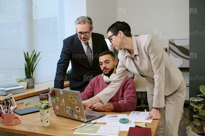 Мужчина среднего возраста и женщина направляют молодого взрослого мужчину с помощью ноутбука