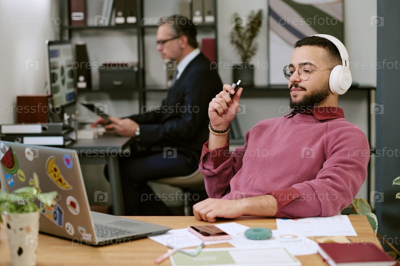 Молодой взрослый мужчина отдыхает с наушниками, работая в офисе
