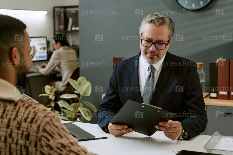 Мужчина средних лет проводит интервью с молодым взрослым чернокожим мужчиной в офисной обстановке