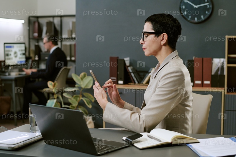 Женщина средних лет использует смартфон во время работы в современном офисе