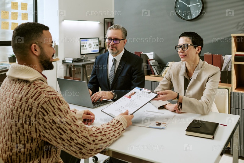 Женщина и мужчина проводят интервью с молодым человеком в современном офисе