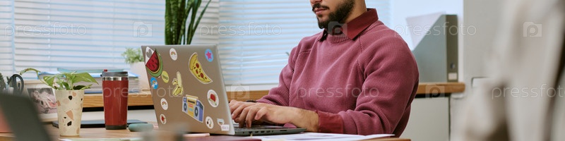 Заголовок молодого взрослого мужчины, работающего удаленно на ноутбуке в современной офисной обстановке