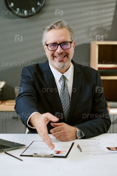 Мужчина средних лет улыбается и протягивает руку за рукопожатие в офисе