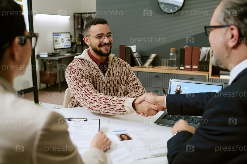 Молодой взрослый мужчина улыбается, пожимая руку во время собеседования