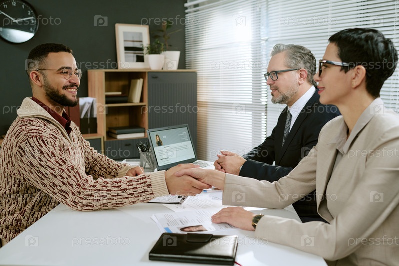 Молодой взрослый мужчина пожимает руку женщине во время собеседования на работу