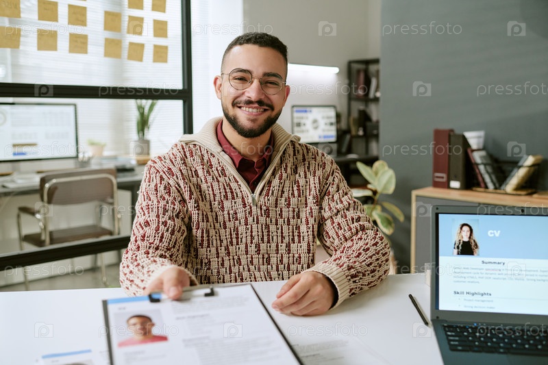 Молодой взрослый мужчина улыбается, передавая резюме во время собеседования