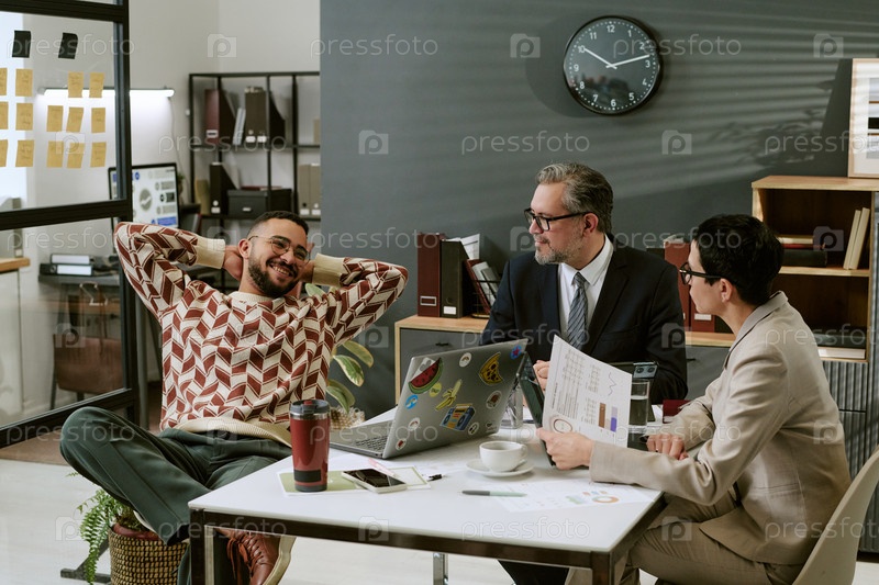 Молодой взрослый человек расслабляется, в то время как коллеги среднего возраста обсуждают