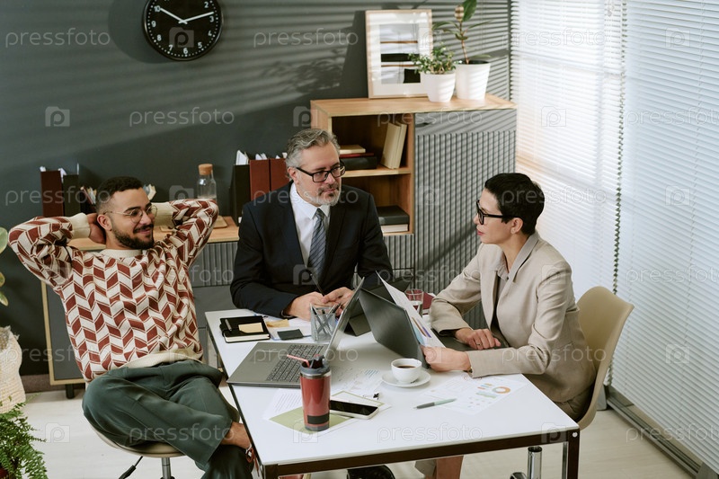 Мужчина средних лет ведет деловую встречу с различными коллегами