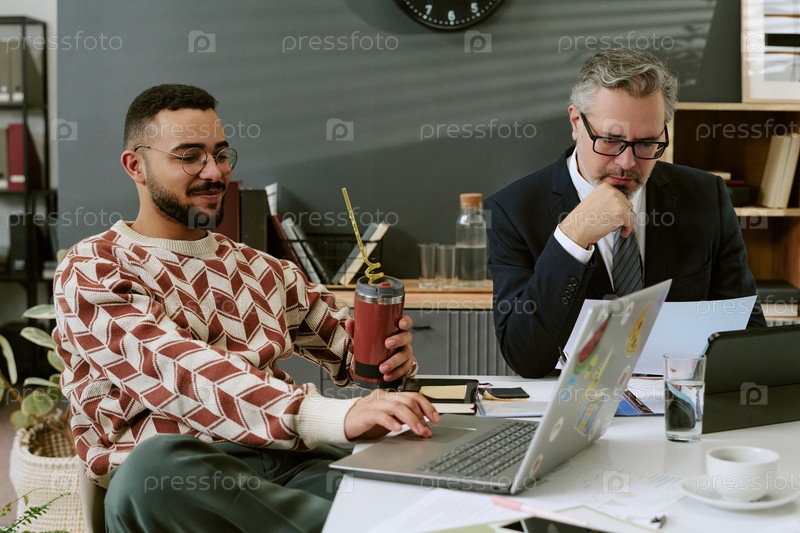 Молодой взрослый человек и мужчина среднего возраста сотрудничают в офисе