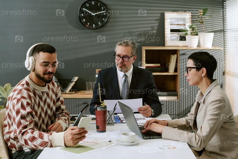 Мультиэтническая команда сотрудничает во время деловой встречи в современном офисе