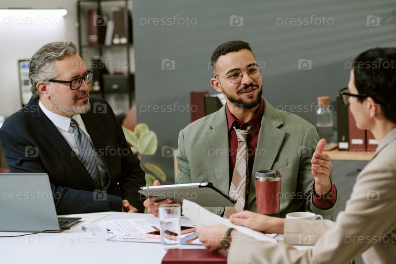 Мультиэтнические молодые профессионалы, обсуждающие бизнес-стратегию в офисе