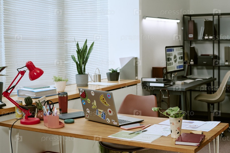 Современный офисный стол с ноутбуком и канцелярскими принадлежностями в творческом рабочем пространстве