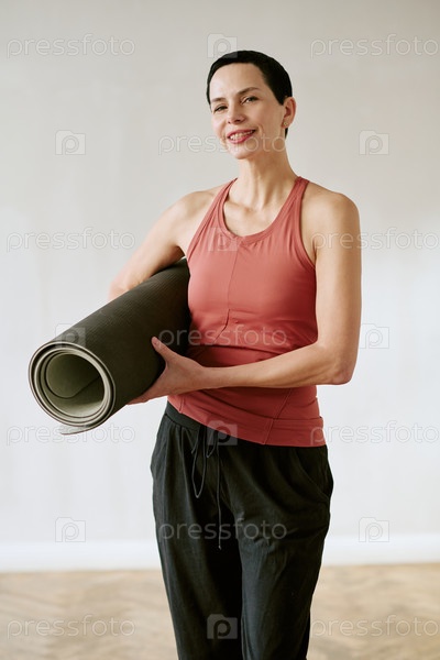 Портрет женщины среднего возраста, держащей матку для йоги и улыбающейся в помещении